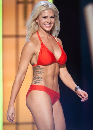 Uma mulher do Estado do Kansas que espera ser coroada Miss América 2014 na noite deste domingo (15) colocou a meta pessoal bem perto do coração: ela a tatuou na lateral do tronco.